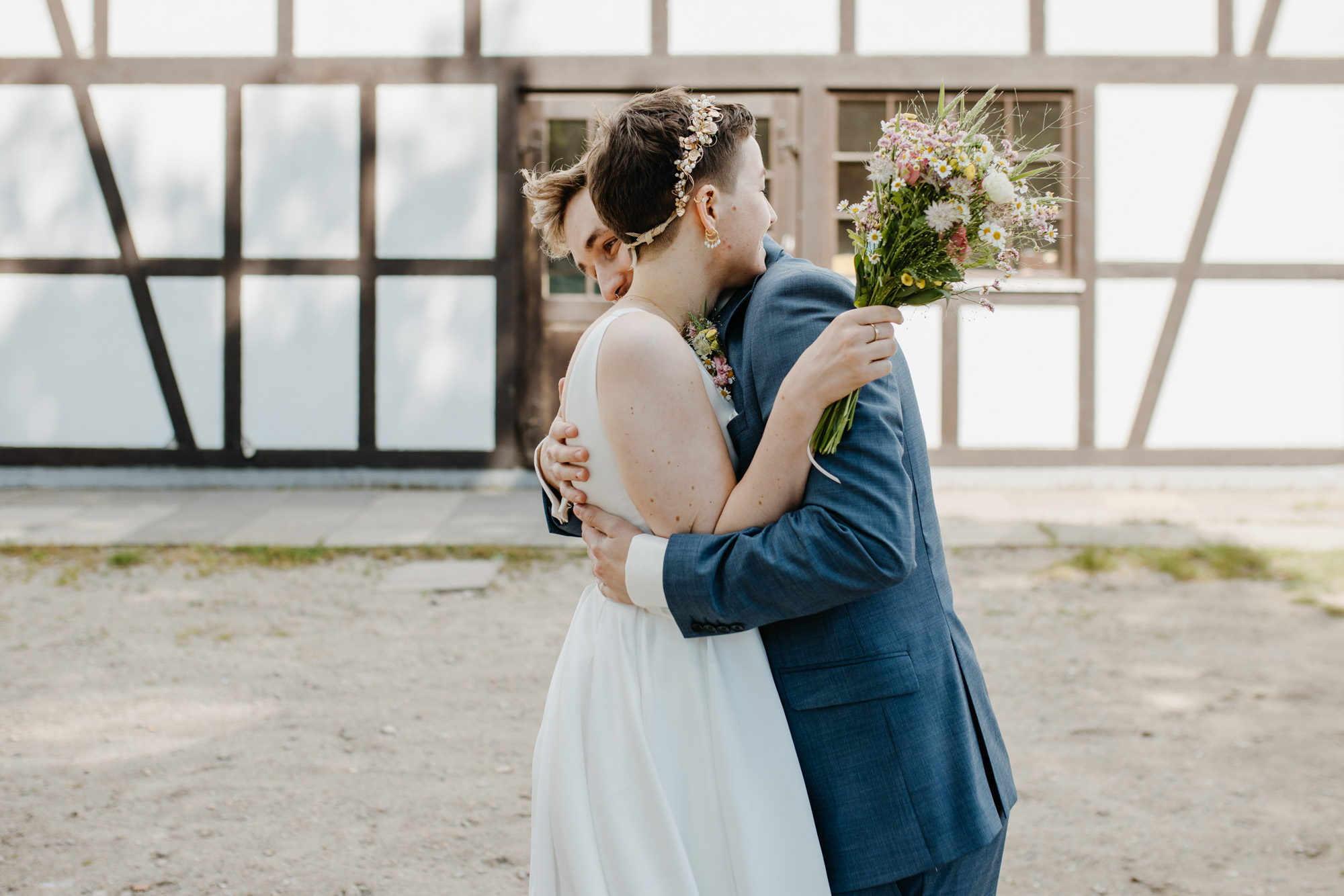 Nach der Trauung blieb Zeit zum Feiern an Bord, für Glückwünsche und entspannte Gespräche. Anschließend ging es für die Portraits raus ins Grüne: Paarfotos auf den Feldern in Brandenburg. Die Weite, das sanfte Licht und die natürliche Ruhe bilden einen wunderbaren Kontrast zur Stadt und zum Schiff – perfekt für authentische, zeitlose Bilder.